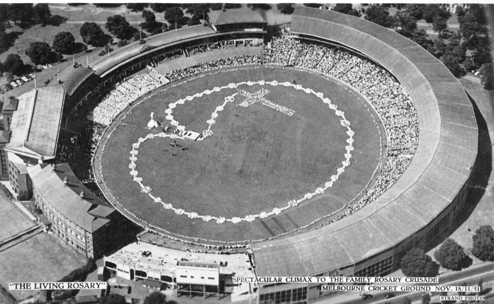 The Family Rosary Crusade came to Australia and New Zealand in the 1950s. Lena Santospirito was inspired by Fr Patrick Peyton and his crusades and she kept literature produced by Family Rosary Inc. Mrs Santospirito also arranged for Family Rosary Inc's Handbook for Priests to be translated into Italian. For more information see Series 14 - Rosary Crusade of Fr Patrick Peyton. Melbourne Catholics form a 'living rosary' at the Melbourne Cricket Ground, 18 November 1951. |
