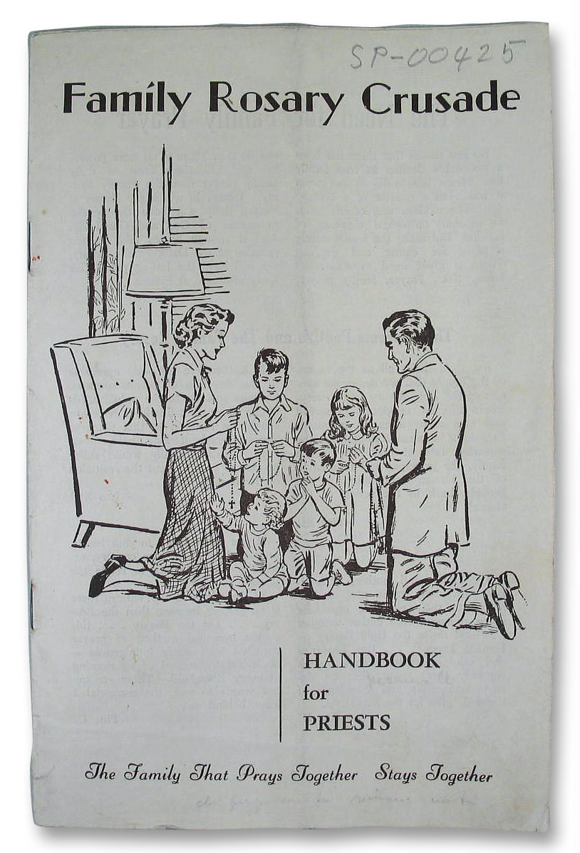 Such forms of worship grew increasingly common in the immediate post World War Two period. Naomi Turner writes, 'in the 1950s, public devotion to the Blessed Virgin reached its peak. Perpetual novenas to the Blessed Virgin were enthusiastically begun in many parishes'.[1] The story of Fr Patrick Peyton, CSC and his Family Rosary Crusades demonstrates the popularity of Marian devotion during this period. Fr Peyton was the Director of 'Family Rosary Incorporated', which had offices in New York, Hollywood and Kansas City. Peyton, who was born in Ireland in 1909 and migrated to the United States, had 'pledged himself to increase devotion to Mary in thanksgiving for his recovery from illness'.[2] Peyton's Family Theatre on Sunset Boulevard started to produce popular religious radio programs from 1947. Peyton went on to use the mass media to spread his message of the power of the Rosary. The Irish-American priest took his Family Rosary Crusades and Prayer Rallies all over the world in the 1950s, and he visited Australia twice to spread his message that 'The family that prays together, stays together'. |