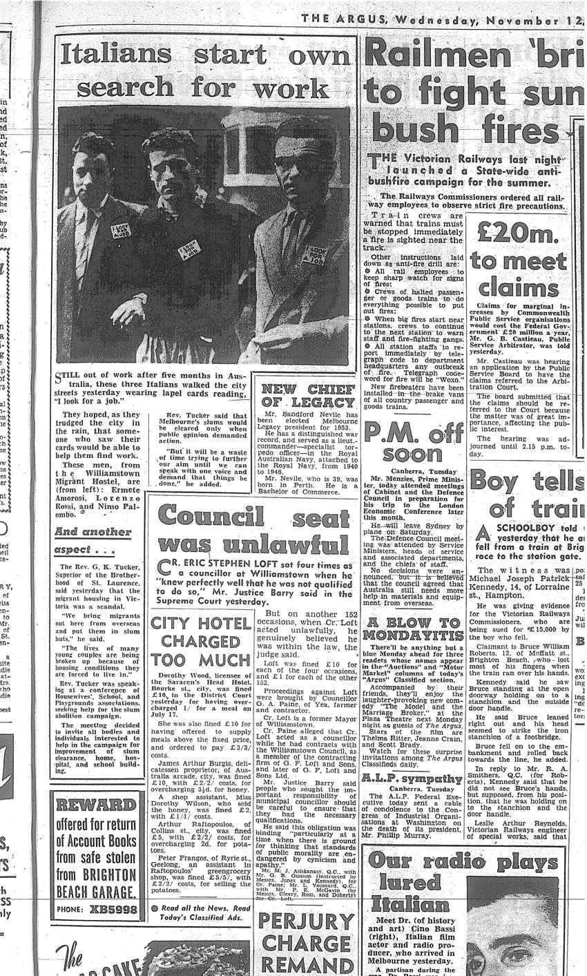 Much of Mrs Santospirito's time as President of the Archbishop's Committee was devoted to finding jobs for Italian migrants. Migrant unemployment became a huge problem in Australia in the early 1950s, when an economic down-turn and recession drastically lowered the job prospects for the steadily increasing numbers of post-war migrants. |